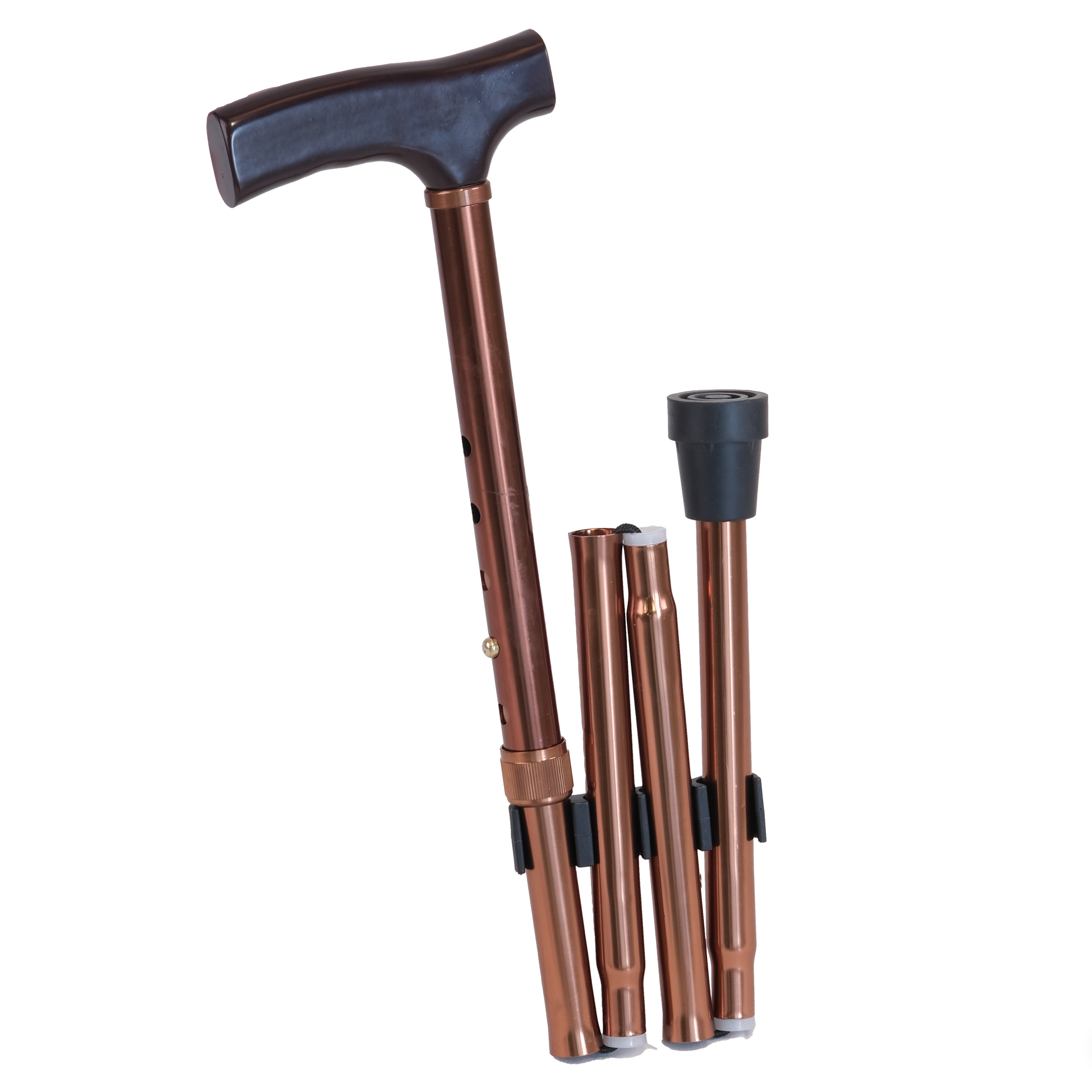 The perfect walking stick for travelling. Quick release clips allow the 4 parts to fold, while remaining connected, and clip into its travelling attachment. Lightweight aluminium with a rubber tip.